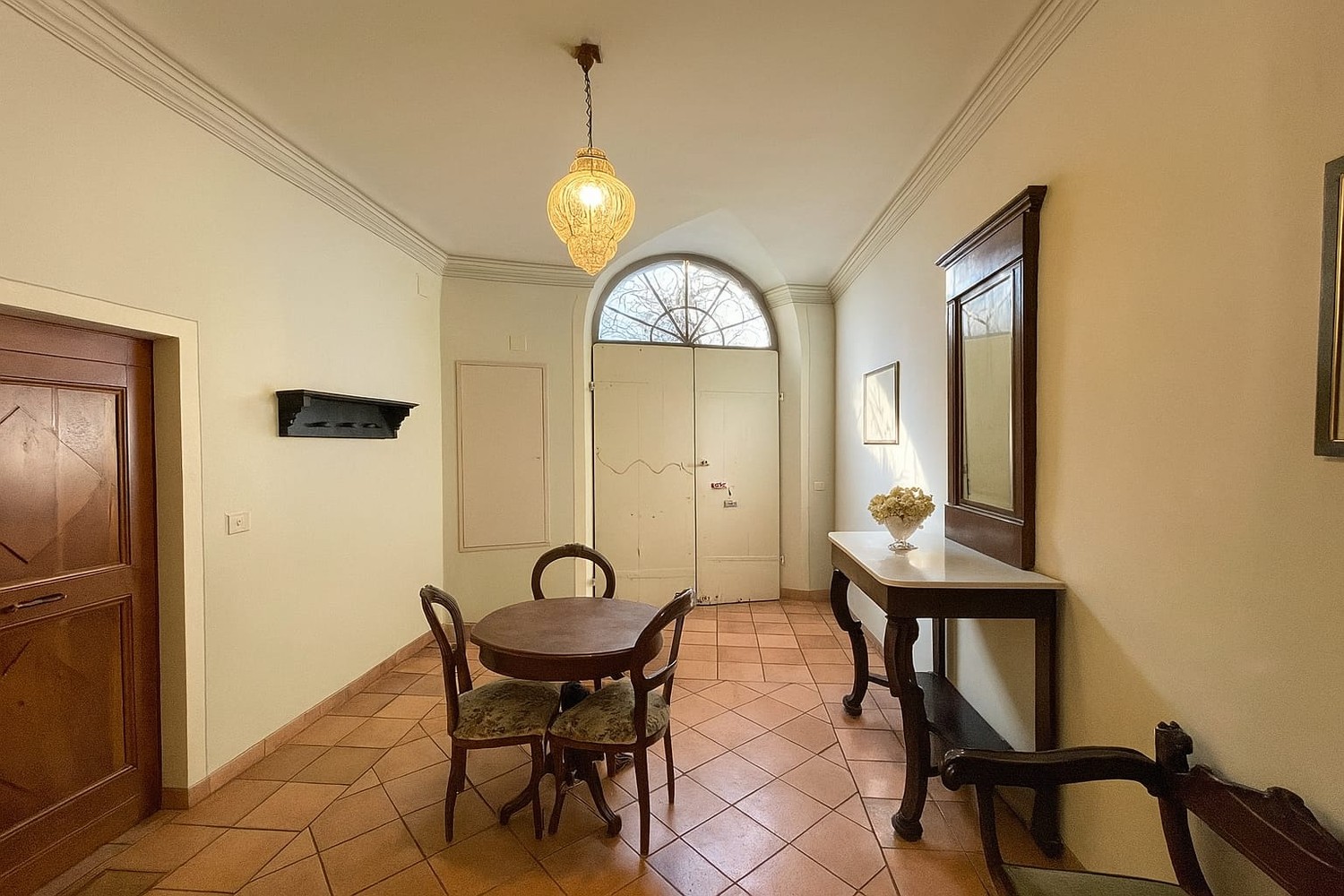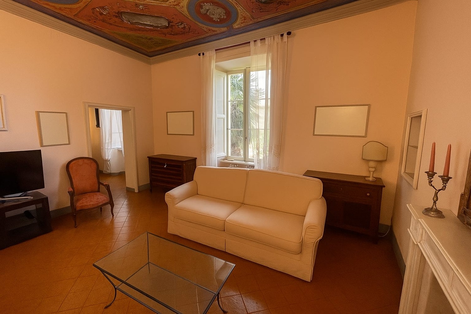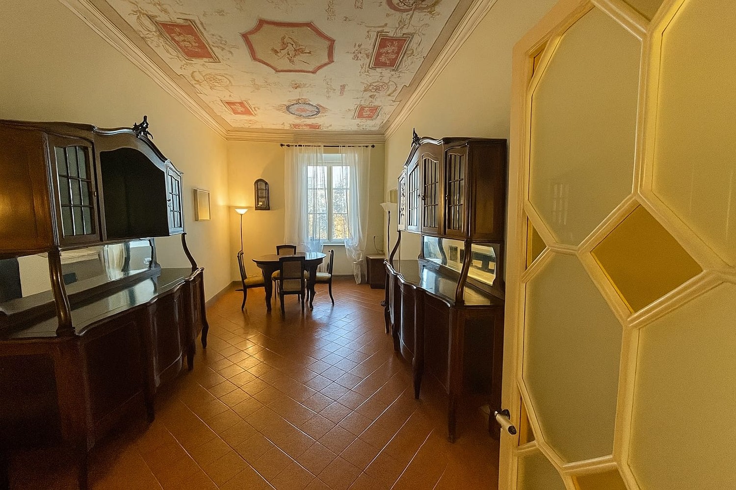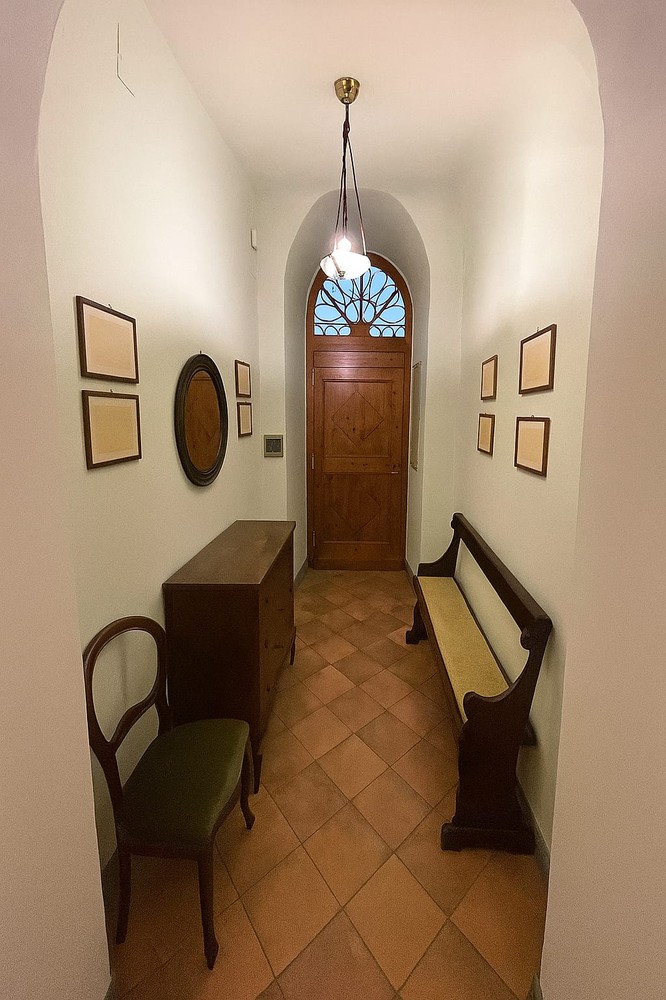In palazzo notificato del centro storico appartamento in buone condizioni di circa 140 mq. con eleganti affreschi, travature importanti, elementi decorativi e di finitura eccellenti. Ha ingresso al piano terreno ma gli affascinanti affacci sono al primo e secondo piano. E’ composto da ingresso importante, un primo salottino, zona pranzo, bel soggiorno con caminetto, cucina abitabile, bagno, due camere grandi di cui una con terrazzo, ripostigli vari.