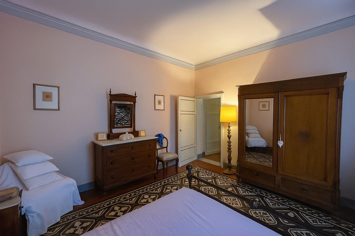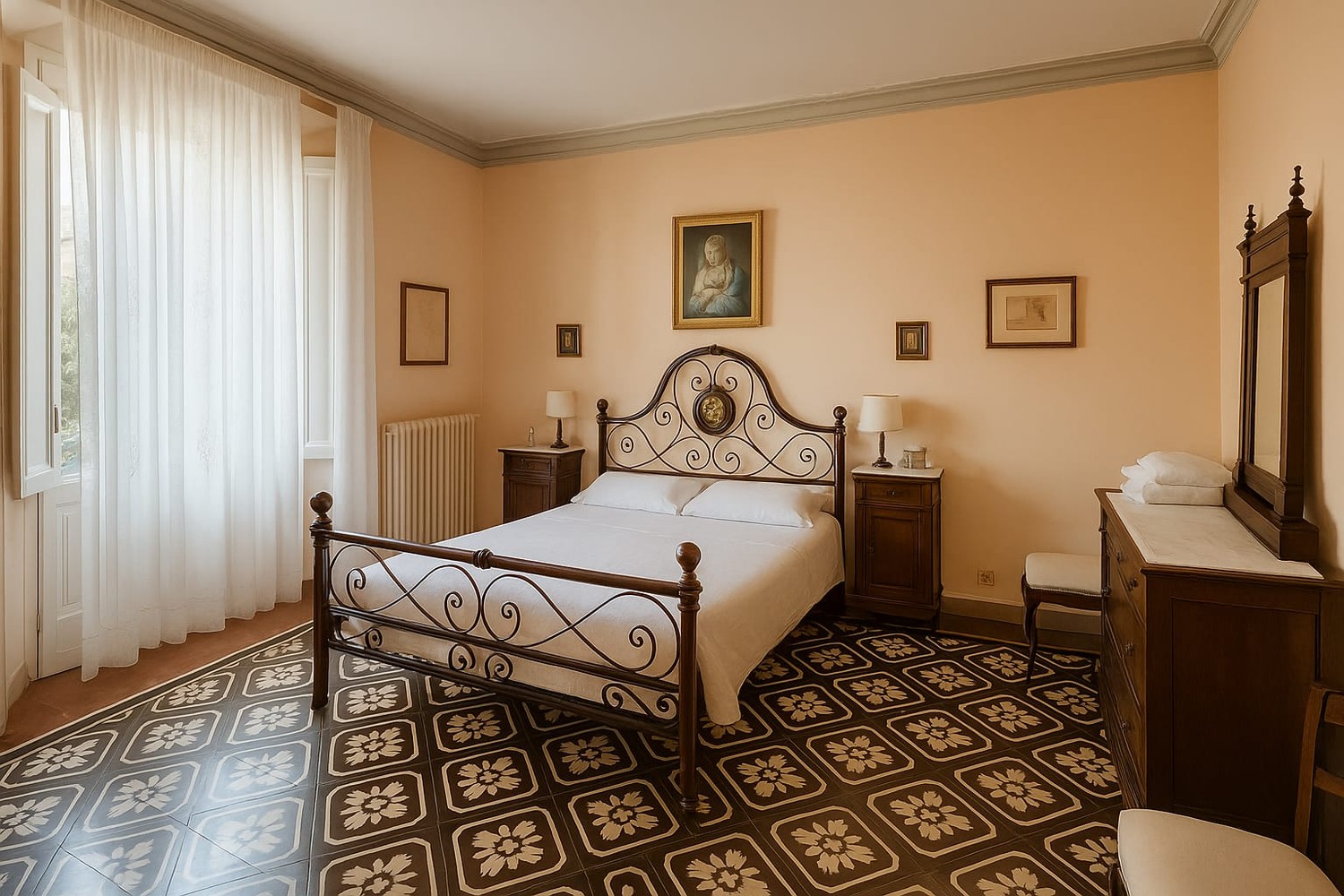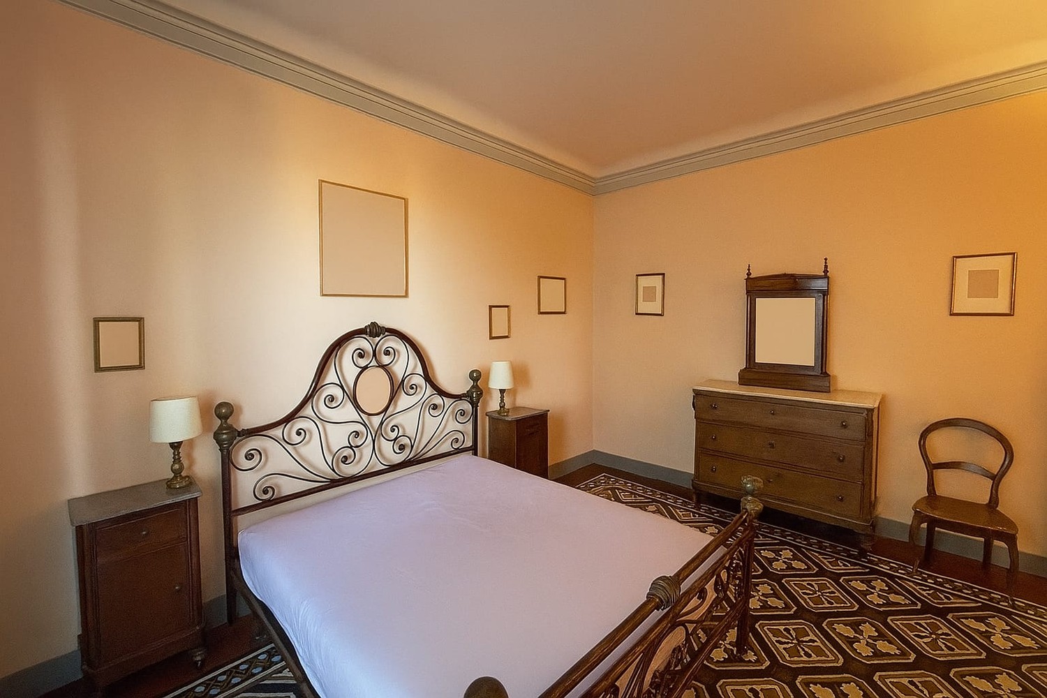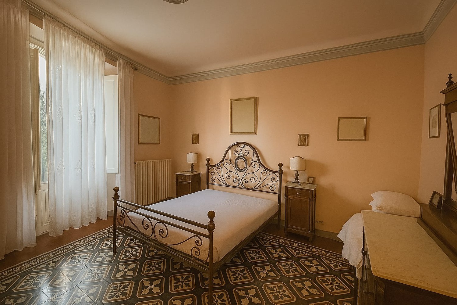 In palazzo notificato del centro storico appartamento in buone condizioni di circa 140 mq. con eleganti affreschi, travature importanti, elementi decorativi e di finitura eccellenti. Ha ingresso al piano terreno ma gli affascinanti affacci sono al primo e secondo piano. E’ composto da ingresso importante, un primo salottino, zona pranzo, bel soggiorno con caminetto, cucina abitabile, bagno, due camere grandi di cui una con terrazzo, ripostigli vari.